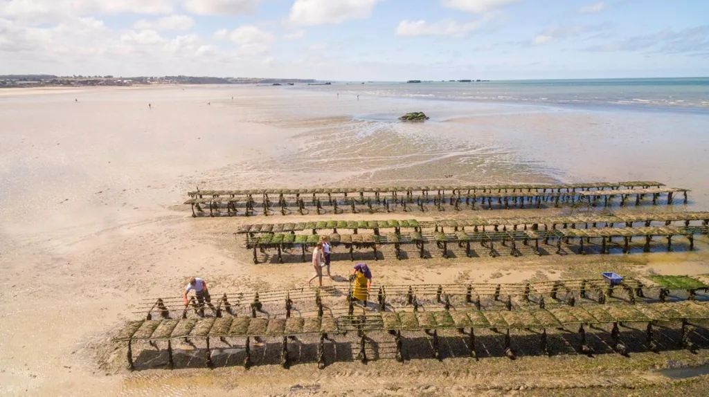 Avant d’arriver ici au parc à huîtres, les huîtres grandissent en mer du côté d’Asnelles et Meuvaines, à quelques kilomètres de Courseulles-sur-Mer.