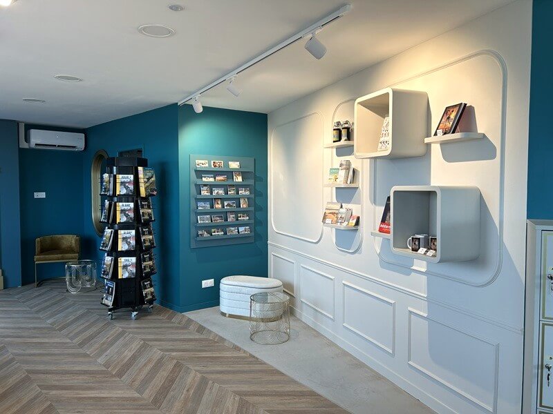 La décoration et le mobilier, déclinés dans des tons blanc, bleu et or, s’inspirent du style Belle Époque à travers les formes, moulures et courbes, tout en intégrant une touche de modernité.