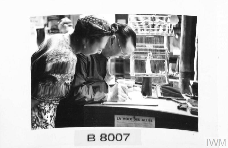 M. Gazeau et sa fille vérifient minutieusement les textes de la Voix des Alliés, crédit : IWM B 8007