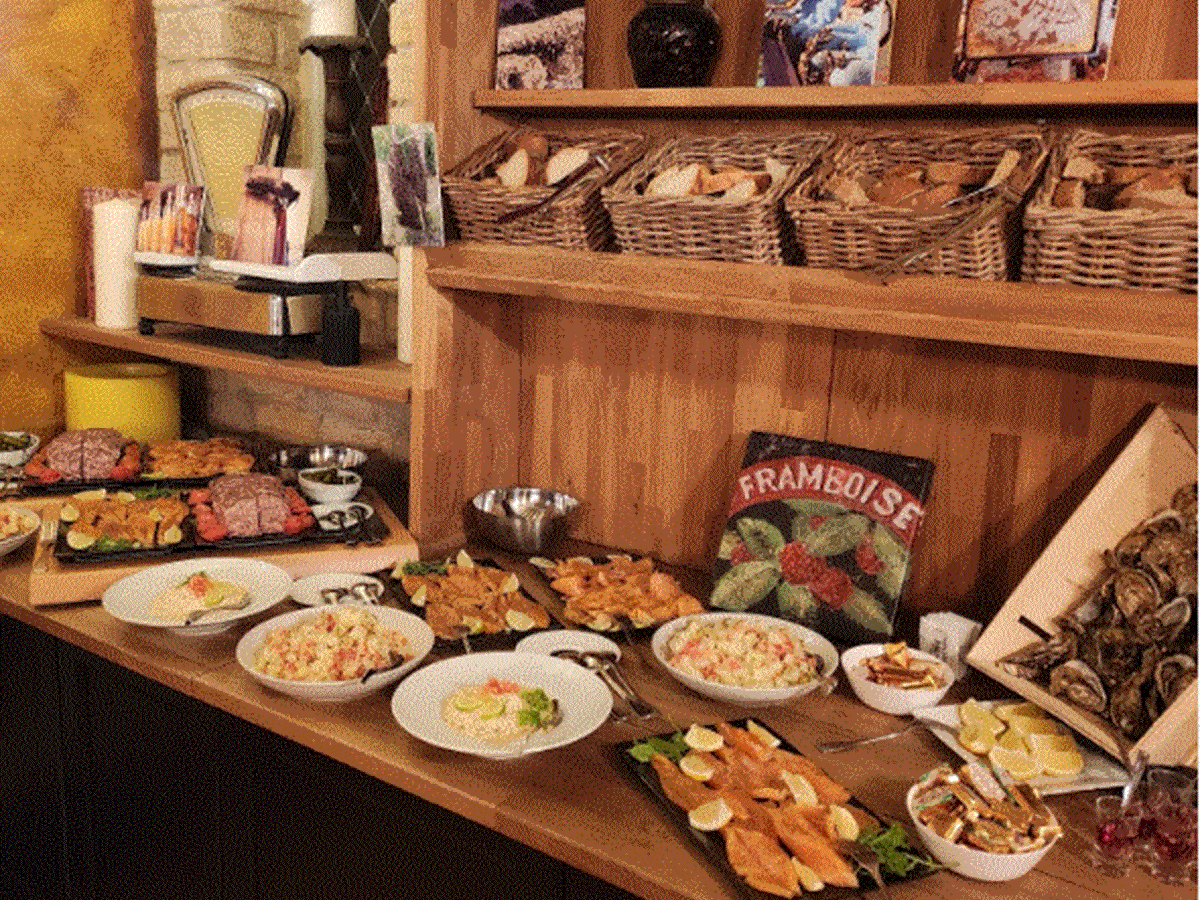 Geniet van een gastronomische en verfijnde keuken: zeevruchten, wilde zeebaars en tarbot, sint-jakobsschelpen (afhankelijk van het seizoen), kalfszwezerik met morillecrème, stoofpot van niertjes en zwezerik, geïndividualiseerde rib-eye, gesneden en gevuld met huisgemaakte foie gras, en vele andere heerlijke gerechten om te ontdekken.