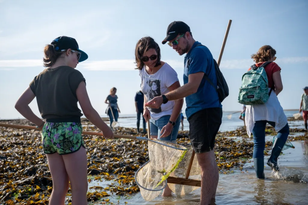Armé d’une épuisette, partez à la découverte de la faune et de la flore qui se cachent parmi les rochers et les algues de la Côte de Nacre.