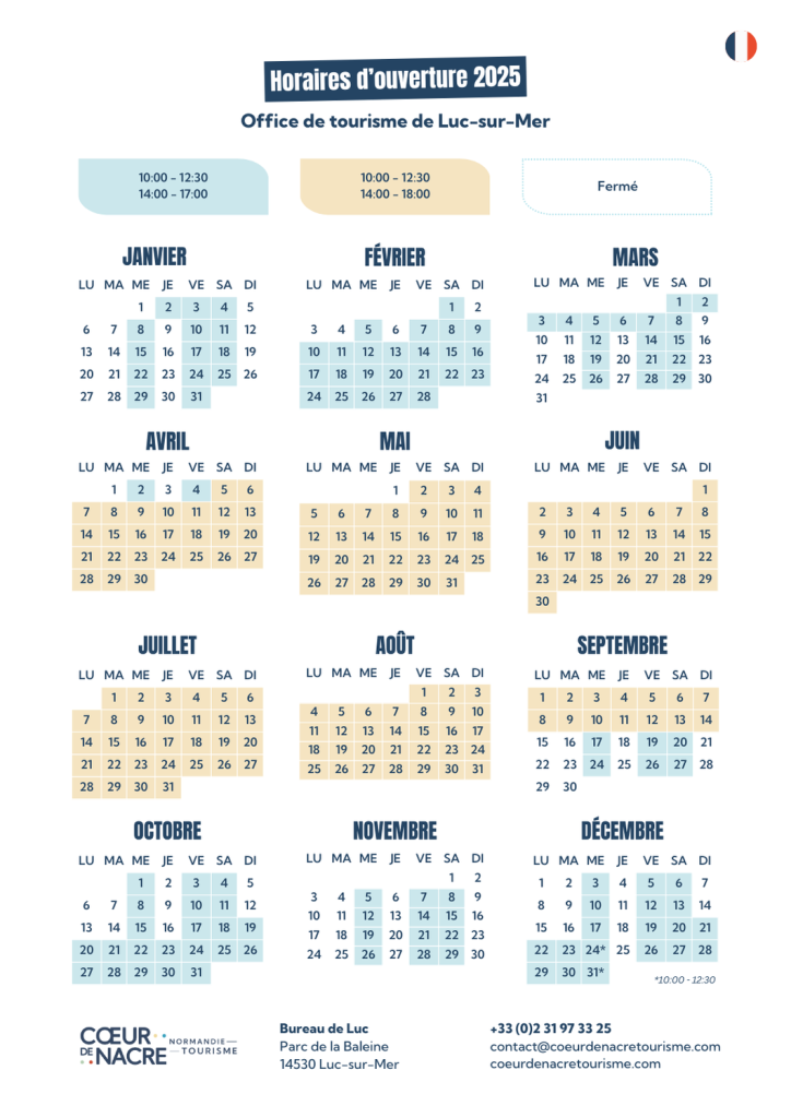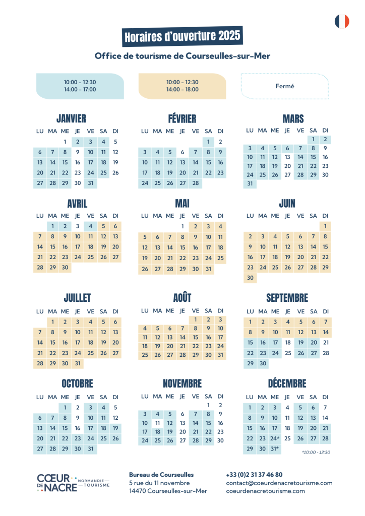 - Lundi, mercredi, samedi hors vacances scolaires, 10h-12h30 et 14h-17h,