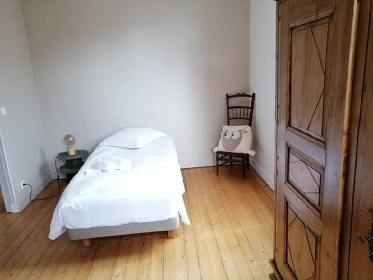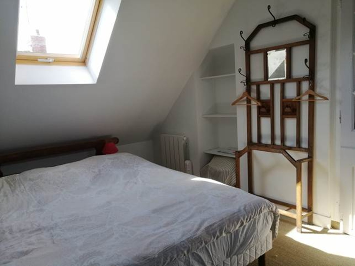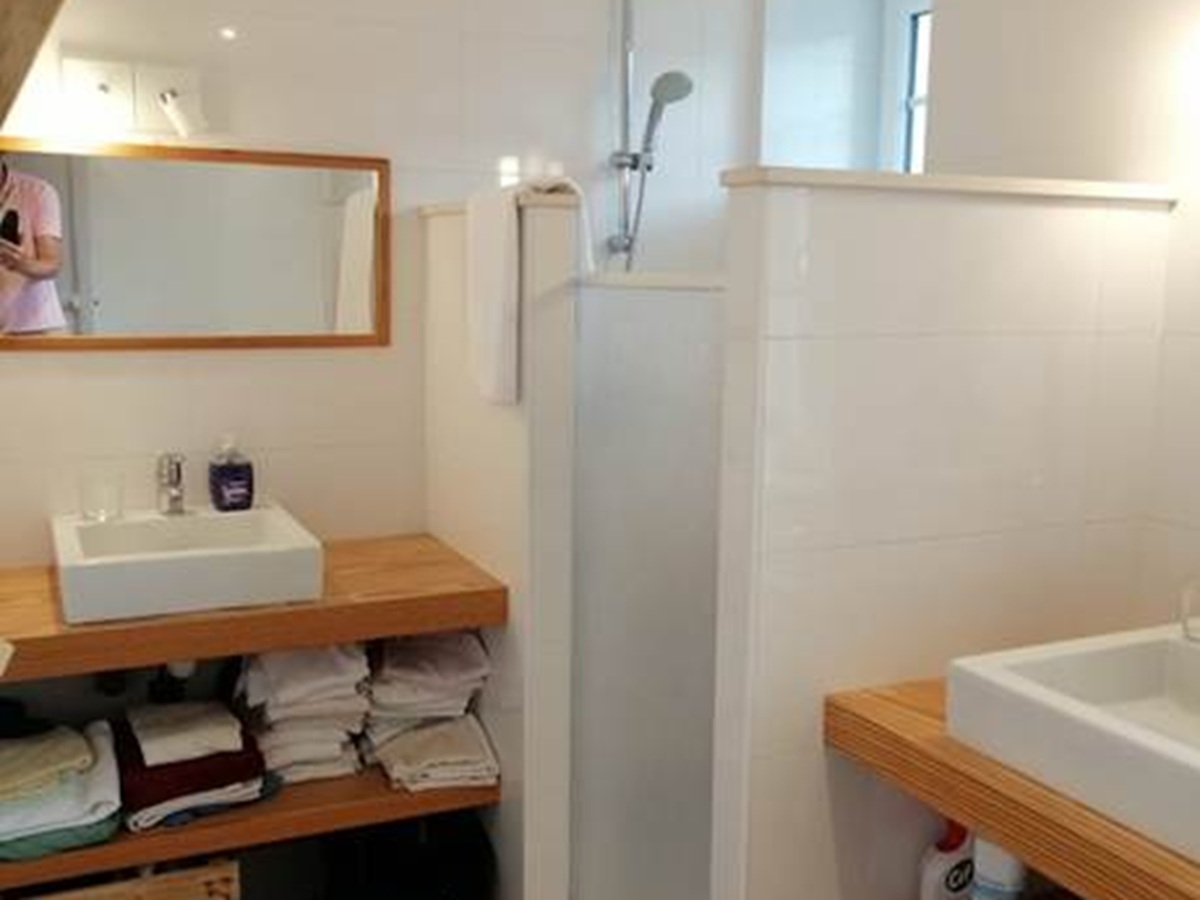 2ème étage : Une suite sous les toits avec un grand lit (160x200) et sa salle d’eau privée. Le palier accueille également un lit d’appoint pour une configuration flexible.