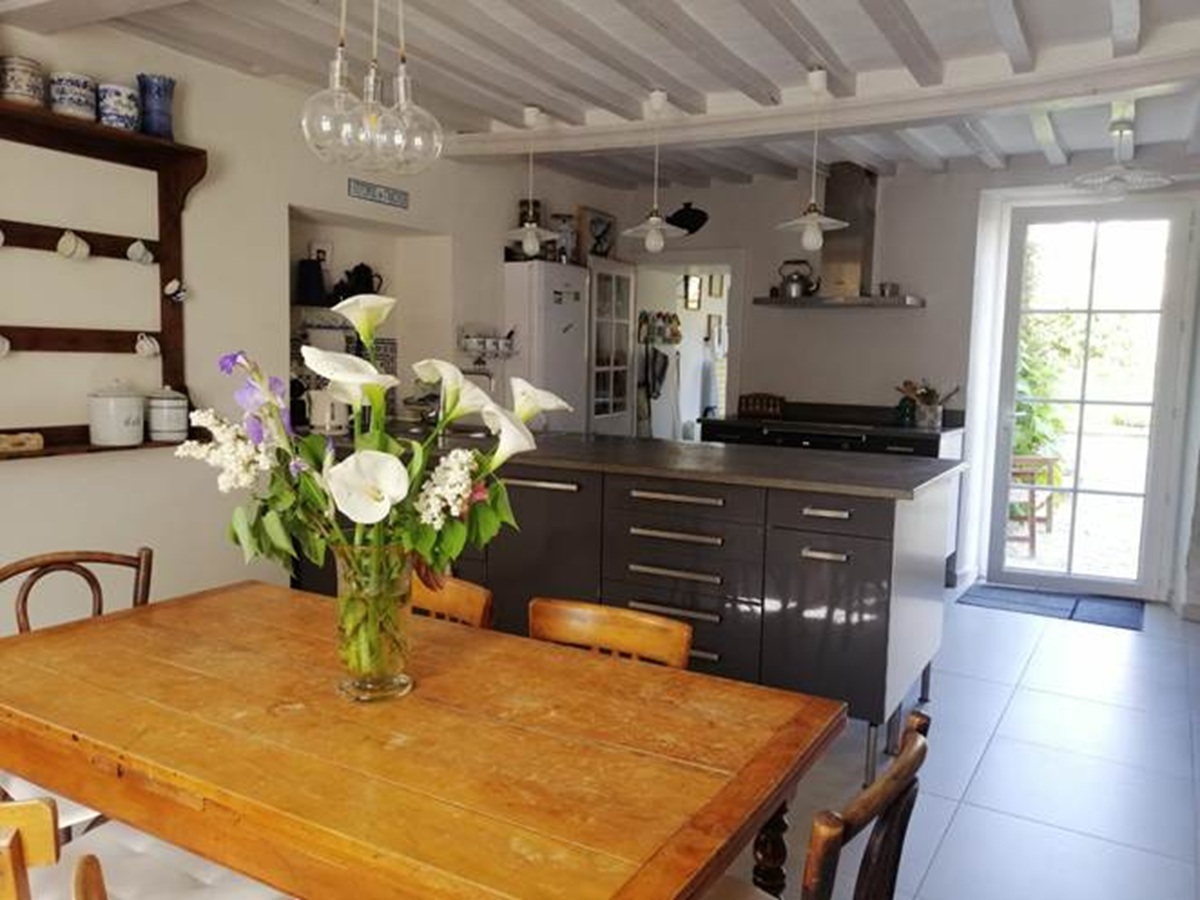 Rez-de-chaussée : Le cœur de la maison. Une grande cuisine dînatoire ouverte pour des repas partagés, et un salon chaleureux avec sa cheminée.