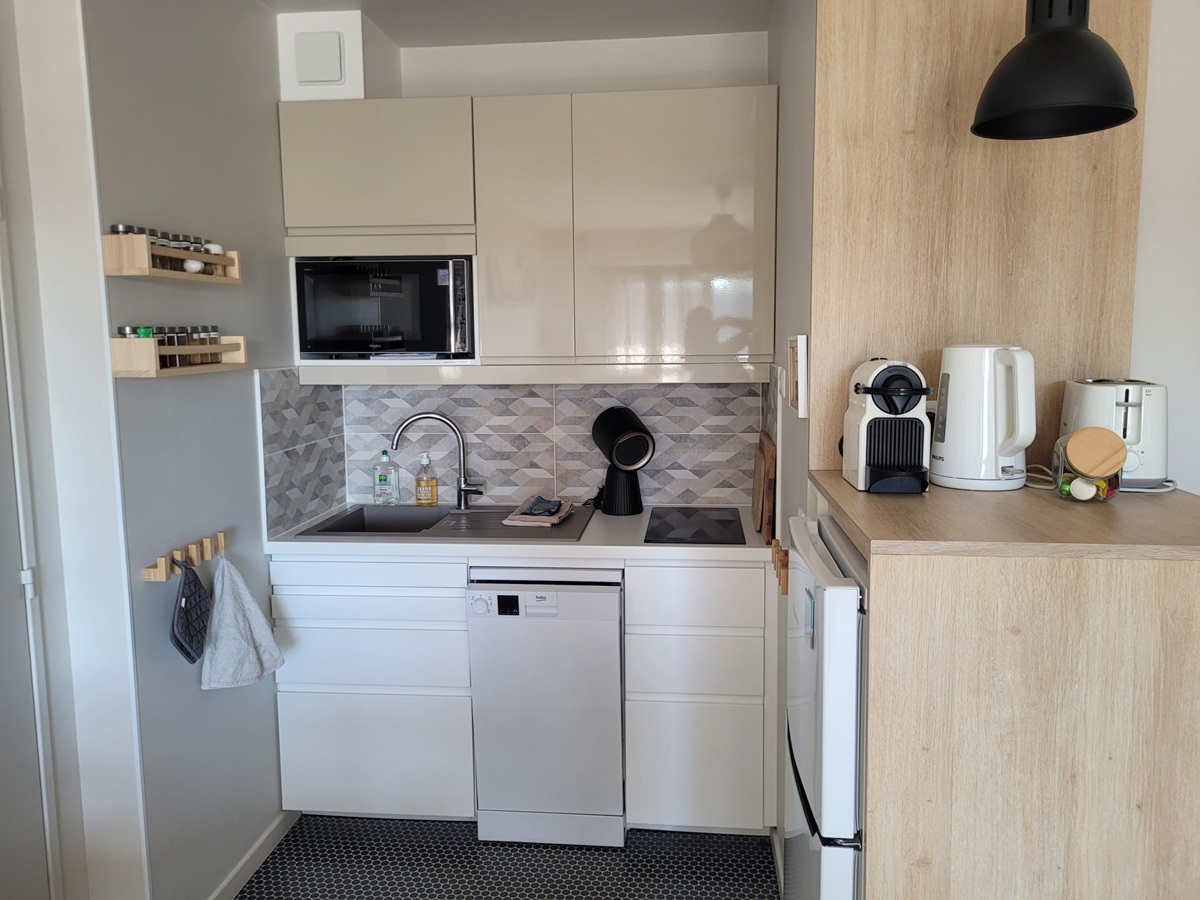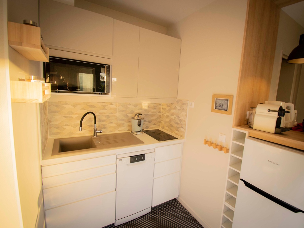 Cuisine ouverte toute équipée : lave vaisselle, four micro-ondes combiné, induction, Nespresso, grille-pain, bouilloire. Linge de cuisine fourni.