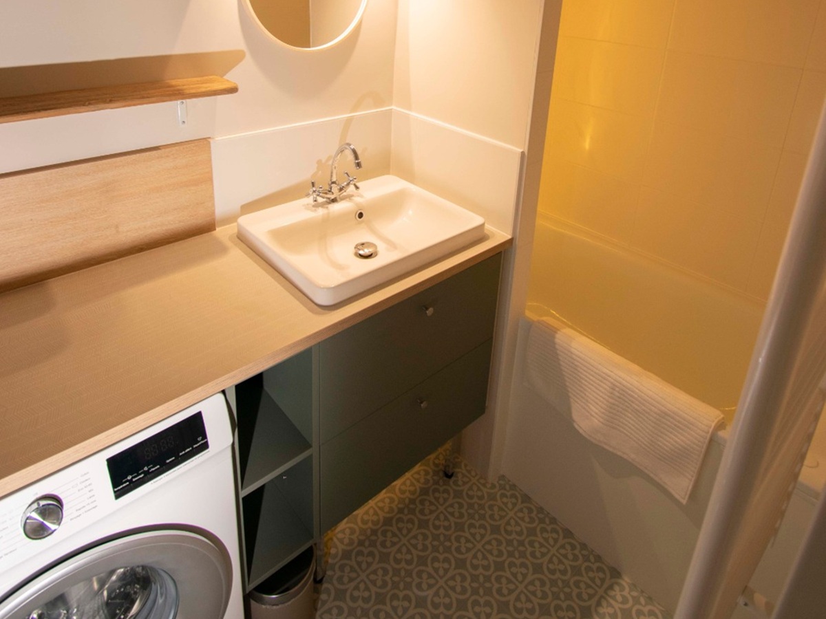 Salle de bain avec baignoire (haute) et lave linge. Une serviette (70 x 140) par personne de plus de 3 ans fournie, et le tapis de bain.