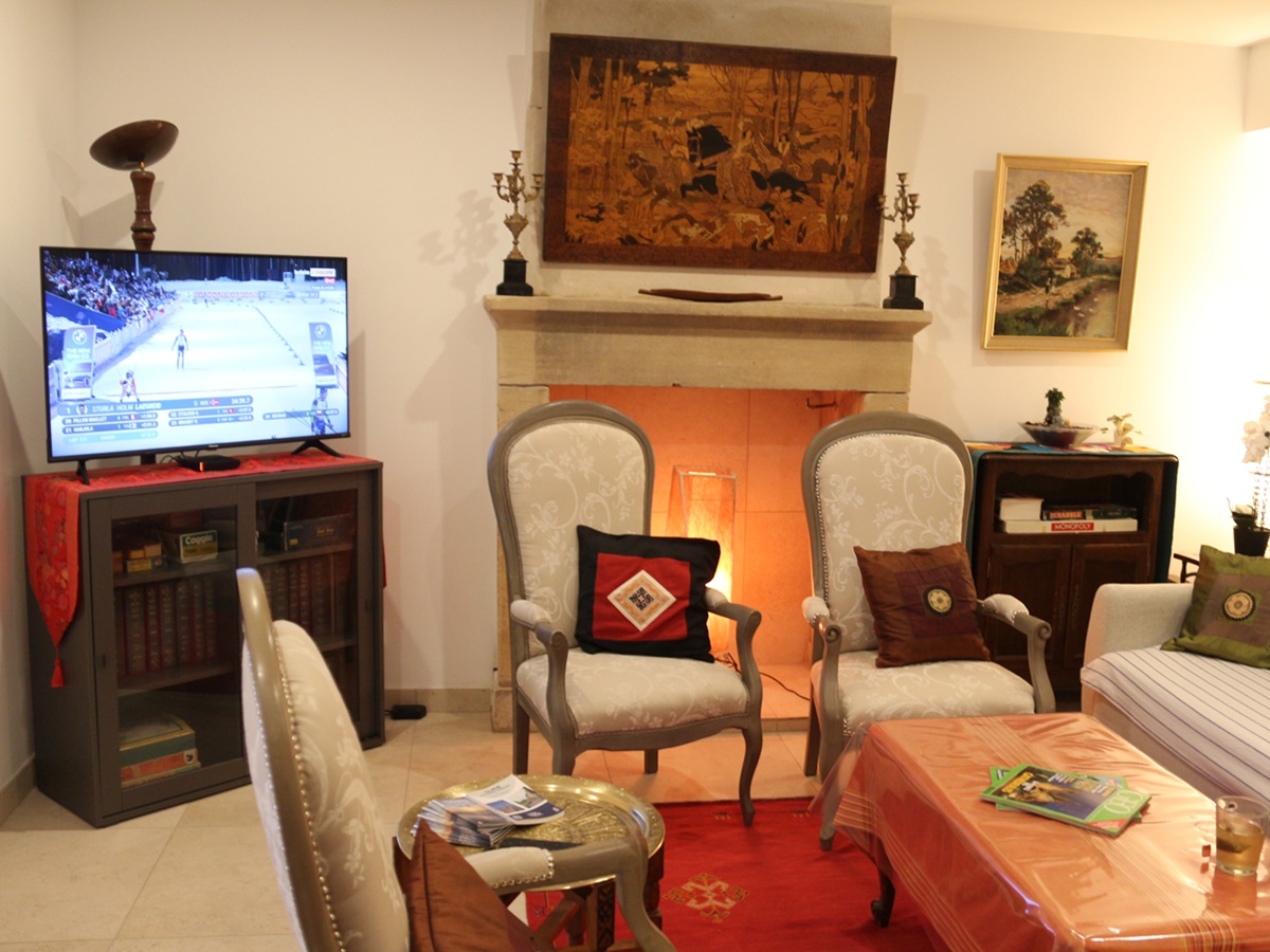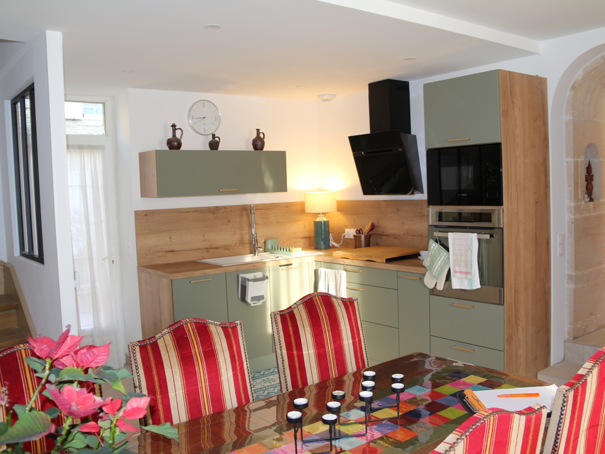 L'intérieur a été conçu pour offrir aux familles un séjour relaxant et dépaysant. Le salon, avec sa cheminée monumentale en pierre et ses fauteuils de caractère, constitue un espace de détente privilégié invitant à l'évasion. Pour vos repas, vous profiterez d'une cuisine contemporaine parfaitement équipée, ouverte sur un espace de vie lumineux. Une salle à manger spacieuse, dotée d'une grande table conviviale, permet de partager des moments chaleureux après une journée de découvertes. Les chambres, aux ambiances colorées et soignées, mêlent mobilier ancien et touches ethniques pour vous garantir des nuits reposantes. Chaque étage possède sa salle de bain, et le deuxième est idéal pour l'indépendance des petits et la tranquillité des grands.
