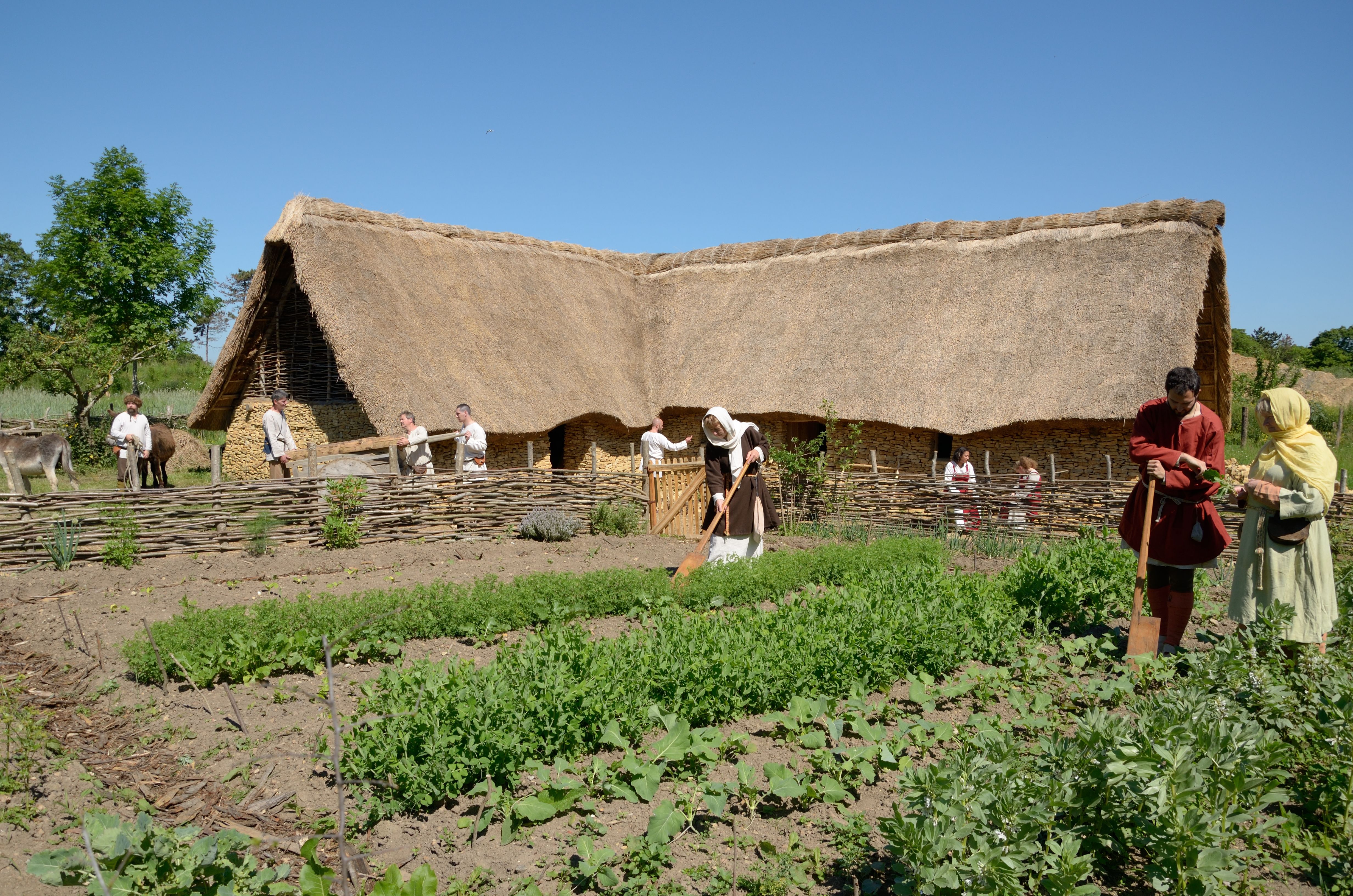 - Pour construire un village carolingien composé de fermes, de jardins, d’ateliers et d’une église,