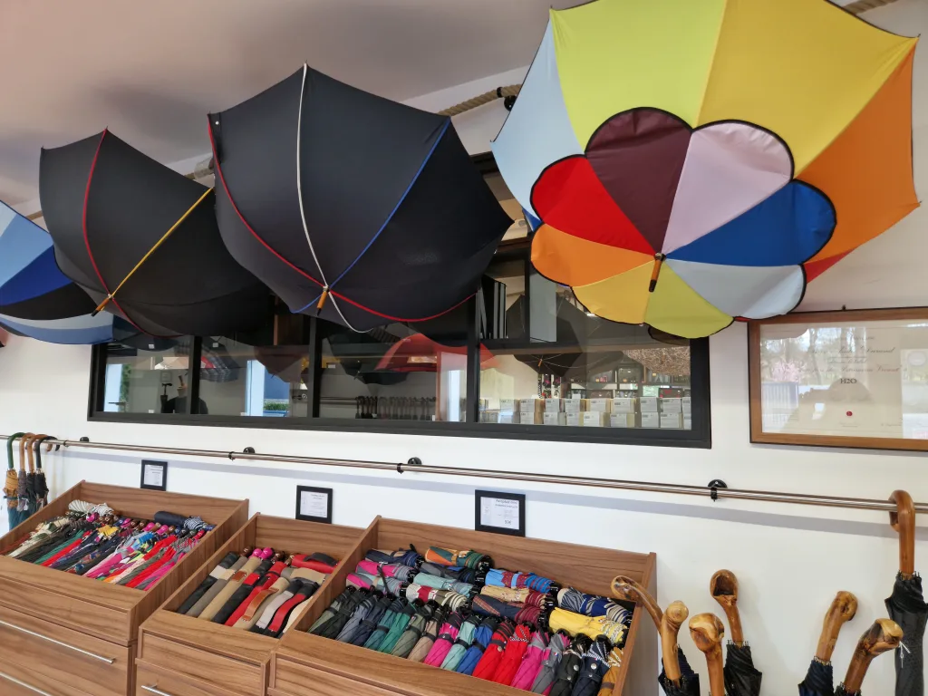 Sur place, est proposée une large gamme de parapluies allant du classique parapluie canne, le rétractable, à l’élégante « ombrelle 1900 » pour protéger des rayons du soleil, ou bien la gamme prestige avec le modèle « golf Deauville ».